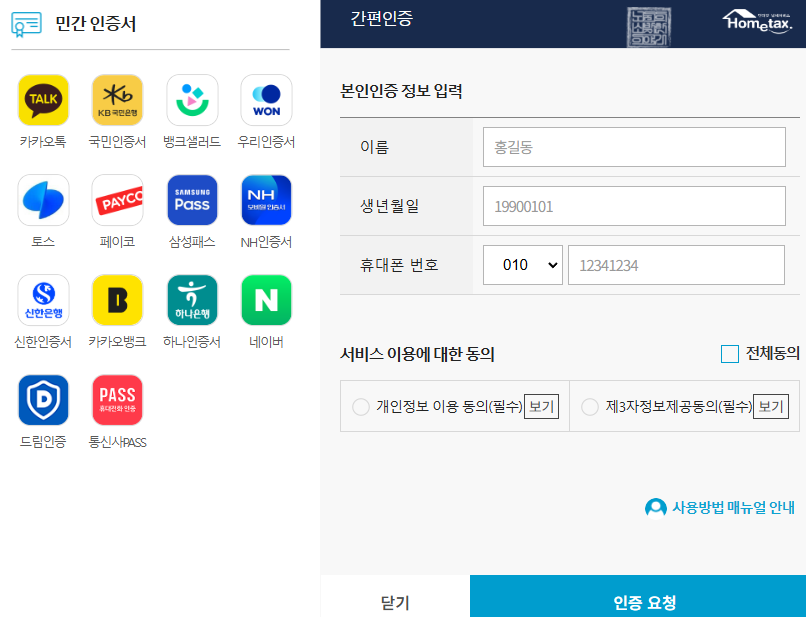 홈택스(손택스)에 로그인하기 위해서는 기본적으로 공동·금융인증서를 통한 로그인이 필요하다. 하지만 요즘은 꼭 구 공동 인증서에 해당하는 공동 인증서나 은행을 통해 다운받을 필요가 있는 금융인증서가 아니라 카카오톡과 네이버 등 간편 인증 로그인이 가능해 편하게 이용할 수 있다. 나는 카카오톡 로그인을 이용했다.