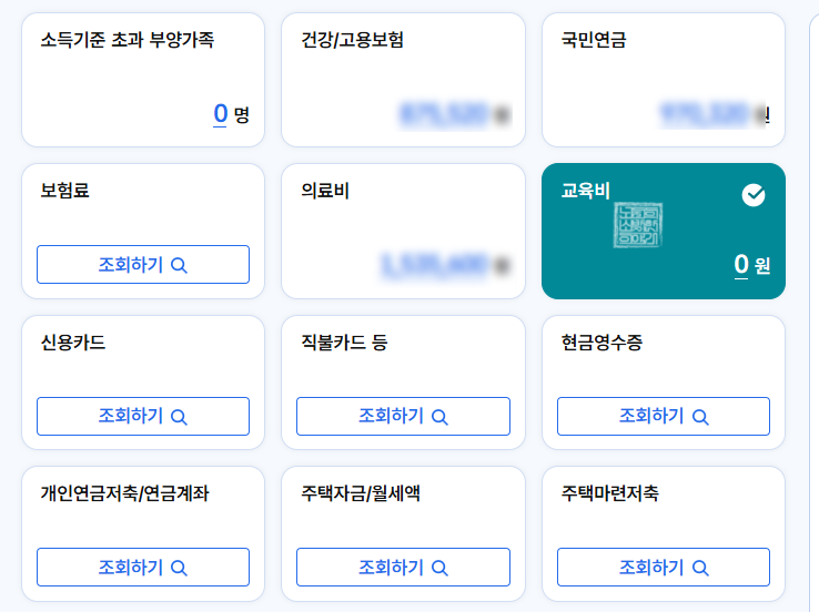 연말정산 간소화 서비스는 이름 그대로 과거 우리가 일일이 카드사와 보험사 등에 접속해서 따로 기록을 조회해야 했던 것과 달리 홈택스 연말정산 간소화 페이지에서 모두 조회할 수 있도록 되어 있다. 위 사진에서 볼 수 있듯이 내가 해당하는 카테고리의 조회하기 버튼을 누른다면 2024년 한 해 동안의 금액을 곧바로 조회할 수 있다.