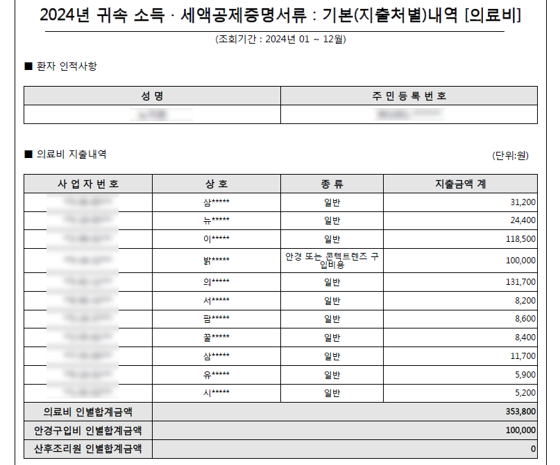 그렇게 내려받은 연말정산 간소화 PDF 자료를 본다면 한 해 동안 내가 소비한 의료비 지출 내역 등 보험료, 카드값 등을 모두 자세히 확인할 수 있다. 알고 보니 안경점에서 구매한 안경 렌즈 구매 비용도 의료비에 포함되어 있었는데, 2024년 한 해 동안 한 차례 바꿨던 안경 렌즈 구매 비용인 10만 원이 의료비에 들어간 것을 확인할 수 있다.