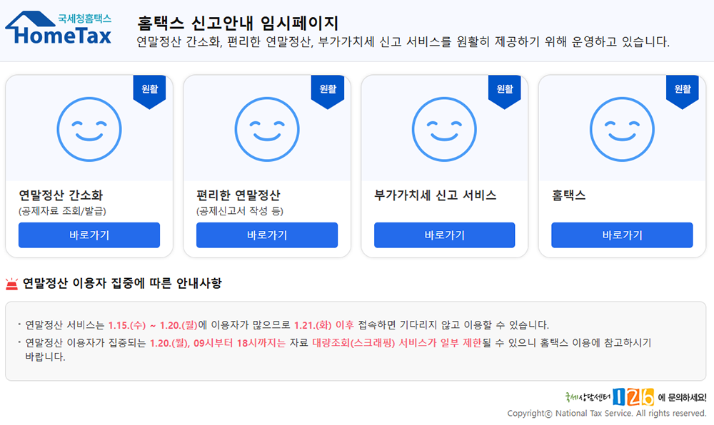 해당 링크를 클릭해 이동할 경우 위 사진에서 볼 수 있는 연말정산 간소화 메뉴 등을 볼 수 있는데, 1월 15일(수) ~ 1월 20일(월)에는 이용자가 많은 탓에 대기가 걸릴 수도 있어 1월 21일(화) 이후 접속하면 대기 없이 이용할 수 있다고 한다. 특히, 연말정산 이용자가 집중되는 1월 20일(월)은 09시부터 18시까지 제한될 수도 있다.
