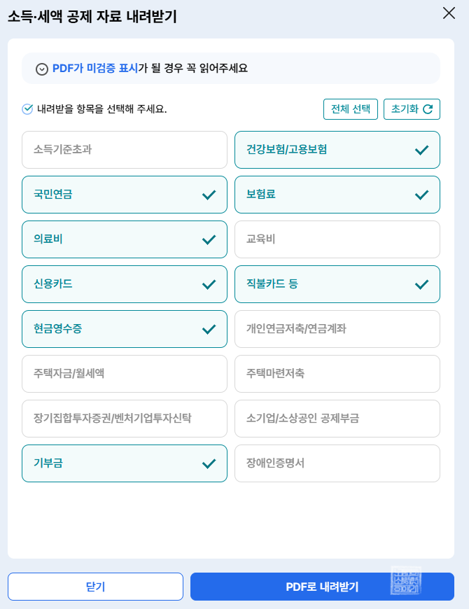 그렇게 모두 확인한 자료들은 우측 상단에 있는 'PDF로 내려받기'를 클릭하면 위 사진의 화면으로 이동하게 된다. 모든 카테고리를 다 조회했을 때 내가 원천 징수한 금액이 있는 카테고리는 모두 체크된 상태로 PDF로 내려받을 수 있는데, 이 파일을 내려받아 근무처와 세무서 혹은 직접 연말정산을 진행하는 데에 이용할 수 있다.