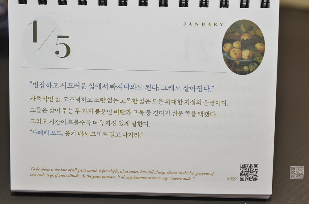 <쇼펜하우어 아포리즘 365 일력>의 1월 5일과 20일의 문장을 첨부한 이유는 이 두 문장이 특별했기 때문이다. 너무 번잡하고 시끄러운 세상에서 살아가는 우리에게 "번잡하고 시끄러운 삶에서 빠져나와도 된다, 그래도 살아진다."라는 문장이, 특별한 것이 없는 우리에게 "인생의 다채로움을 즐기되 너무 특별한 것을 기대하진 마라."라는 문장.