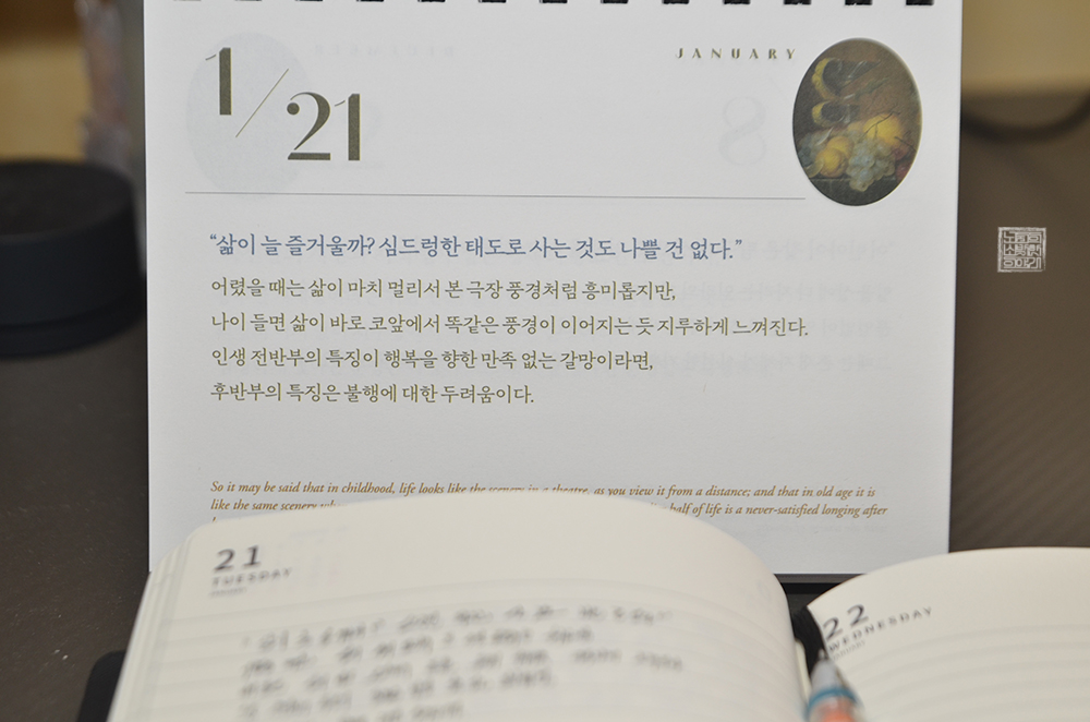 나는 해당 문장을 잠이 들기 전에 내일 하루 일정을 정리하기 전에 다이어리(플래너)에 필사를 하고, 아침에 일어나 어젯밤 적은 일정을 다시 한번 확인하면서 수정할 부문을 수정하면서 다시 한번 <쇼펜하우어 아포리즘 365 일력>을 보면서 문장을 곱씹는다. 그렇게 매일 읽은 문장은 때때로 가슴 깊이 다가오기도 했다.