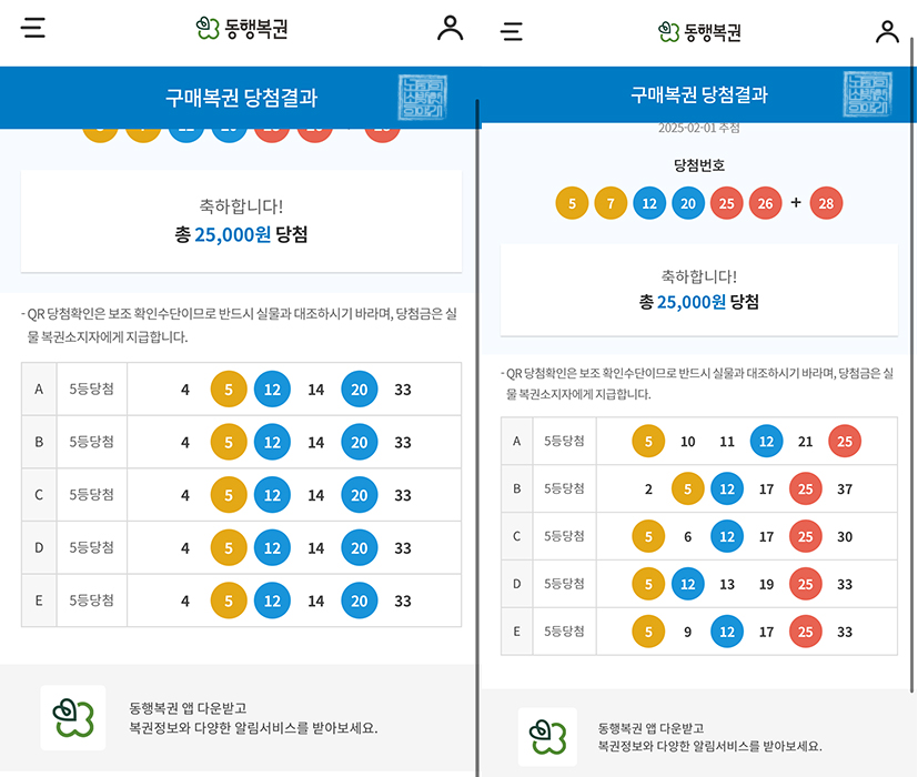 아주 어처구니없게도 5등에만 10개가 당첨이 되면서 나는 50억 도, 5억 도, 5천만 원도 아닌 5만 원을 손에 넣게 되었다. 우스운 점은 수동으로 똑같은 번호 조합 5개를 구매한 로또에서는 5, 12, 20 번호 세 개가 맞았고, 수동과 자동을 섞은 로또에서는 5, 12, 25 번호 세 개가 맞았다는 점이다. 하다 못해 20과 25가 함께 있었으면 했다.