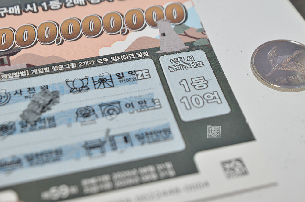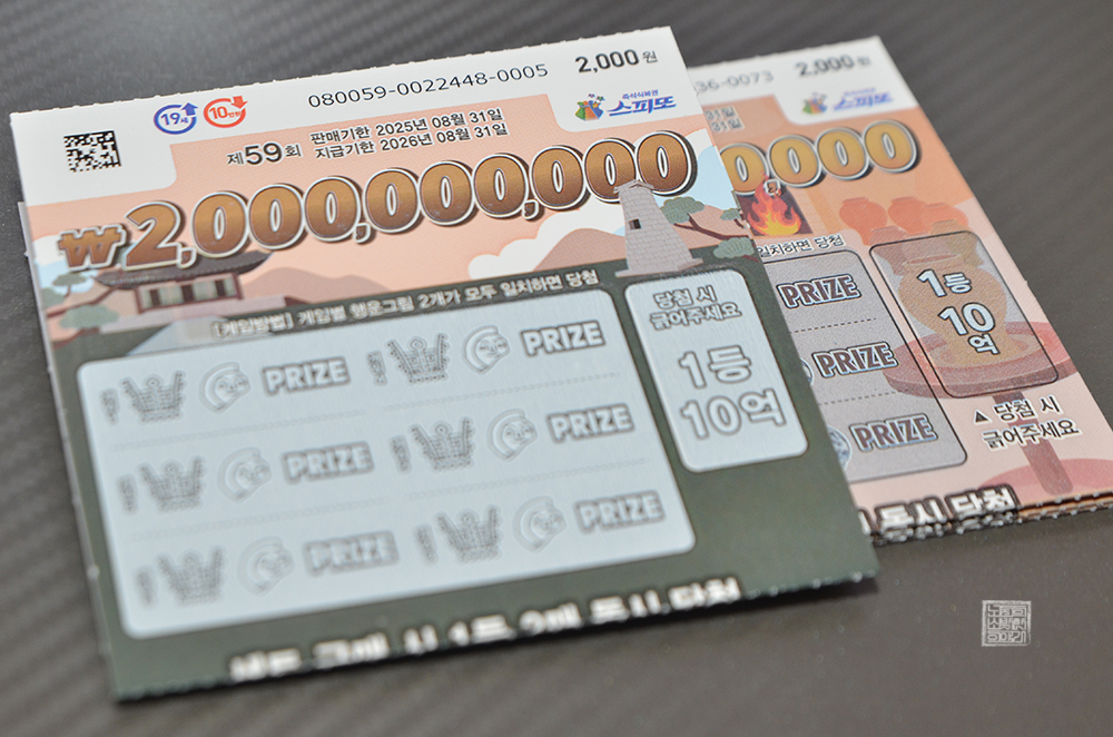 이번 스피또2000 59회는 경주에서 볼 수 있는 다보탑과 그 시절의 문화재가 그려져 있어서 디자인도 제법 괜찮았다. 과거 정말 잘 긁어지지도 않았던 57회와 비교한다면 58회부터 잘 긁히는 재질로 복권이 판매되고 있어 긁는 것도 편했다. 아쉬운 점이 있다고 한다면 내 손에 1등 10억 1세트는커녕 2등 1억, 3등 1천만 원도 들어오지 않은 거다.