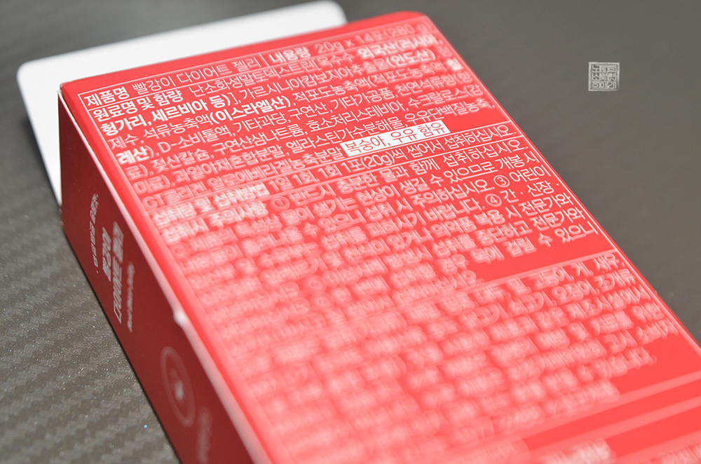 빨강이 다이어트 젤리 제품 뒷면에서 확인할 수 있는 원료를 본다면 가르시니아 캄보지아 추출물이 대표적인 재료인 듯하다. 실제로 제품 상세 페이지에서도 가르시아는 탄수화물이 지방으로 합성되는 것을 억제하여 체지방 감소에 도움을 줄 수 있다고 적혀 있는데, 대체로 많은 다이어트 식품이 같은 종류의 원료를 쓰고 있었다.