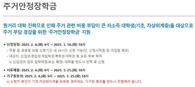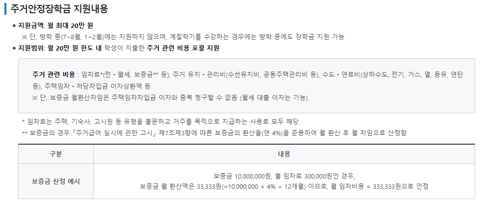 주거안정장학금 지원내용 및 유의사항