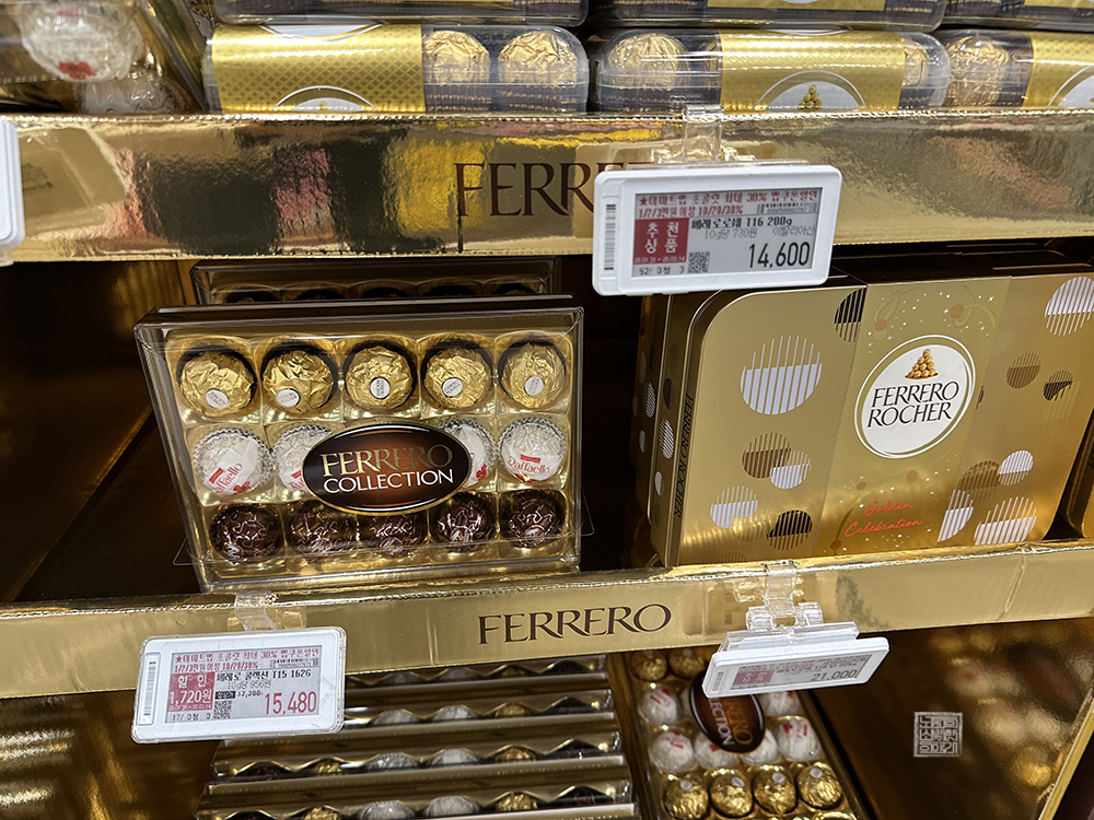 초콜릿을 좋아하는 사람들 사이에서 고급 초콜릿으로 불리는 페레로 로쉐 초콜릿도 거의 모든 품목이 할인 판매되고 있었다. 위에서 첨부한 사진을 본다면 제품마다 할인 퍼센트가 다르다는 걸 알 수 있는데, 가격표를 자세히 보면 '1/2/3만 원 이상 구매 시 10/20/30% 할인'이라고 적힌 것을 알 수 있다.