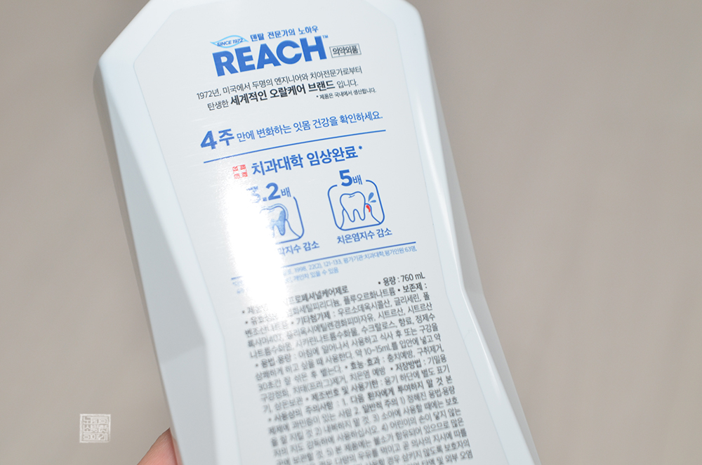 '치과 판매 브랜드'라는 수식어답게 왠지 구강청결제 리치를 이용해 가글을 하면 처음에 익숙한 맛(?)이 느껴졌다. 다른 가글 제품은 조금씩 독한 경우가 많아서(특히 L 제품) 헛구역질이 난 경우도 있는데, LG생활건강의 리치 구강 청결제는 독하지 않아서 마음에 들었다. 가글로 입을 헹군 이후 물로 2~3차례 헹구면 아주 개운하고 깔끔했다.