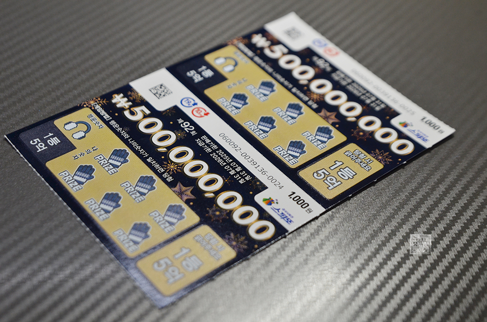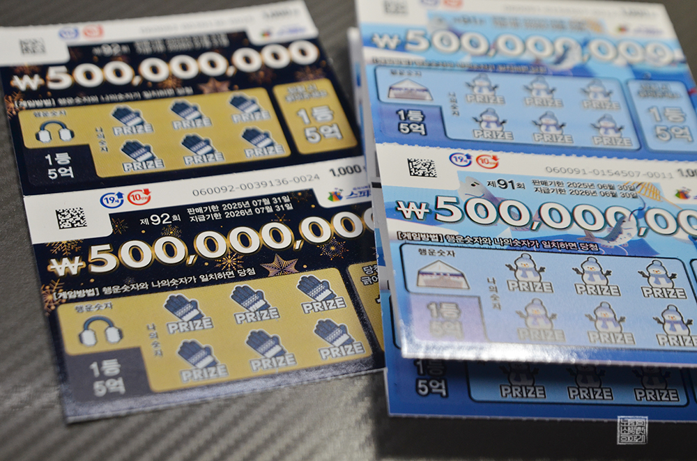 그리고 잔돈 2천 원으로 구매했던 스피또1000 92회는 겨울 방한 용품으로 디자인이 되어 있었는데, 결과는 놀랍게도 모두 꽝이었다. 위아래 행운숫자가 바뀌어서 나왔다면 바로 5억 원 2장이었는데… 세상 일은 그렇게 쉽게 풀리지 않는 법이다. 애초에 판매점 입고율이 4%밖에 되지 않다 보니 1등 당첨 복권이 나오려면 아직 멀었다.