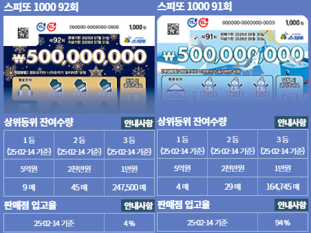 천 원으로 구매할 수 있는 즉석복권 스피또1000은 원래 5억 원을 받을 수 있는 1등 당첨 복권의 수가 9장, 2천만 원을 받을 수 있는 2등 당첨 복권의 수가 45장이다. 2025년 2월 14일을 기준으로 판매점 입고율이 4%밖에 되지 않는 스피또1000 92회는 이제부터 시작이라고 말할 수 있는 단계다.