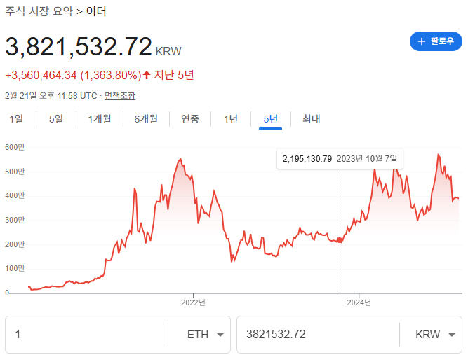 위 사진에서 볼 수 있는 이더리움의 모습은 지난 5년 동안 그 가치가 변한 모습이다. 5년 전인 2020년에는 100만 원조차 하지 않았던 이더리움이 지금은 이더리움 한 개에 600만 원까지 올라갔다가 지금은 400만 원에 머물러 있는 모습을 볼 수 있다. 만약 100만 원도 하지 않았을 때 투자를 했다면 4배의 수익을 올릴 수 있었던 셈이다.