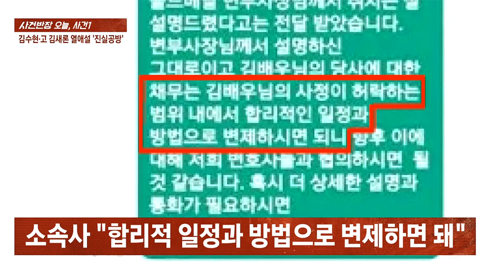 김수현 소속사 측은 김새론이 김수현에게 개인적으로 보낸 살려달라는 메시지가 담긴 문자는 어디까지 법률적인 부분을 이해하지 못해 벌어진 착오라고 주장하고 있다. 확실히 그 나이의 김새론이라면 '내용 증명'이라는 법적인 효력을 갖춘 문서에 대해 잘 모르다 보니 두려움을 충분히 품을 수 있었다. 그런데 다음이 문제였다.