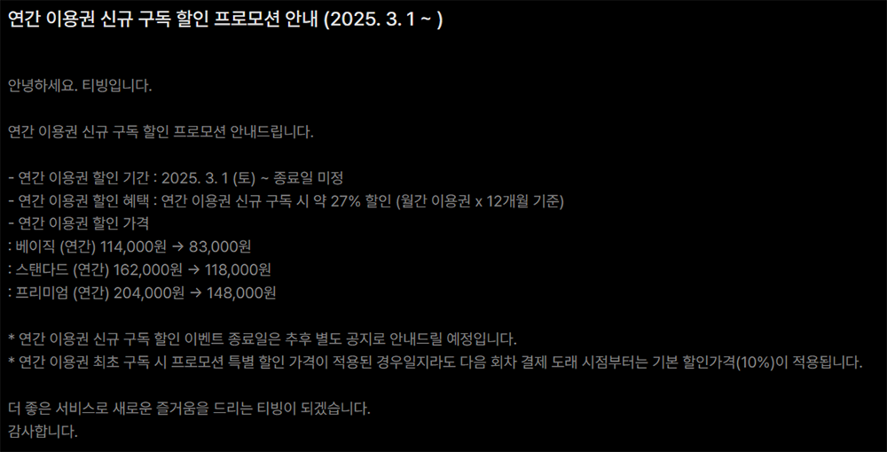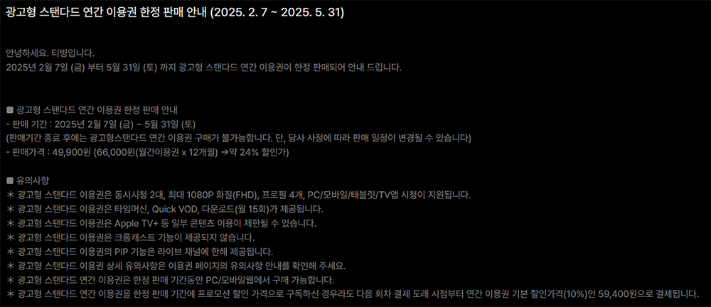 현재 티빙에서는 정해진 기간 동안 연간 이용권을 할인 판매하고 있다. 월 이용권을 매달 결제하는 것보다 연간 이용권을 결제할 경우 24~27% 정도 요금에서 할인을 받을 수 있어서 오히려 결제를 하려고 한다면 지금이 기회였다. 특히, 광고형 스탠다드 연간 이용권은 오는 2025년 5월 31일까지 한정 판매를 진행한다고 한다.
