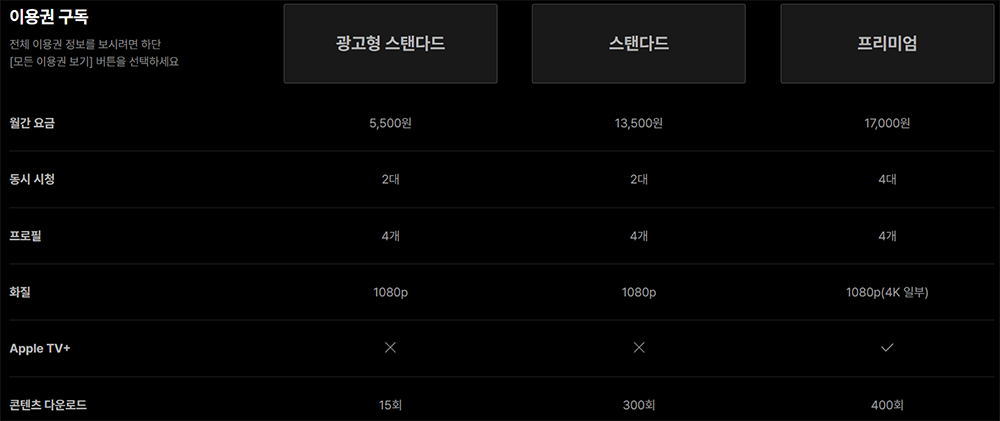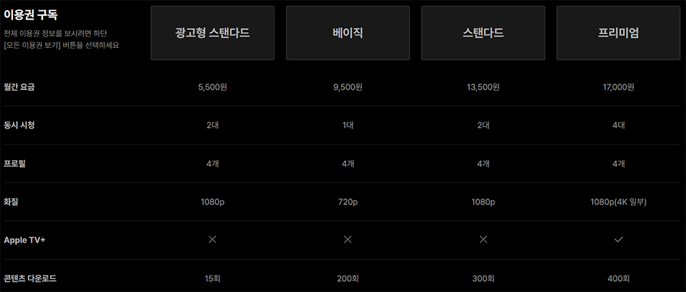 숨겨진 플랜 베이직 9,500원 플랜은 콘텐츠 다운로드는 200회까지 가능해도 화질이 720p까지 지원되기 때문에 화질에 예민한 사람들은 다소 아쉬울 수도 있다. 가장 가성비 좋은 플랜은 광고형 스탠다드 5,500원 플랜으로, 프로필 4개까지 등록을 해서 동시 시청이 2대까지 가능하고, 1080p FHD 화질을 지원하고 있다.