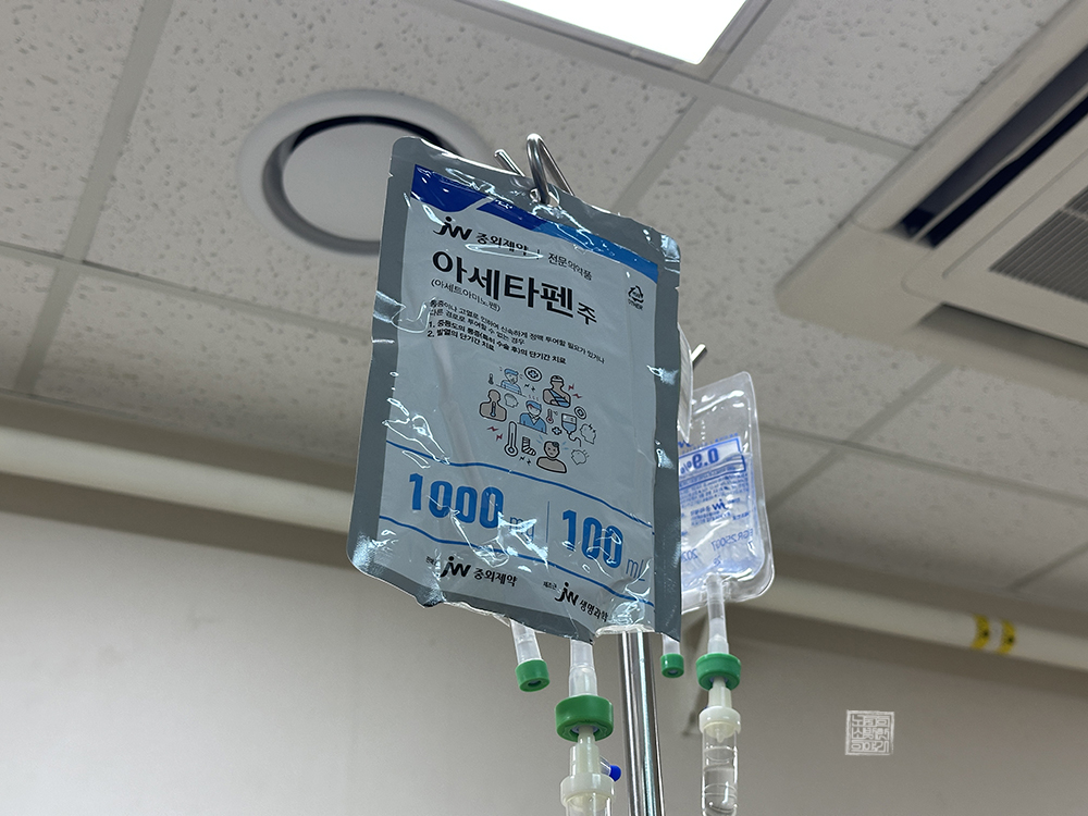 처방받은 진통제는 해열진통제로 알려진 아세트아미노펜으로, 통증이나 고열로 인해 신속하게 진통제를 정맥에 투여할 필요가 있을 경우 사용하는 제품이라고 진통제 포장지에 적혀 있었다. 단순히 진통제만 맞는 게 아니라 근육이완제도 함께 수액과 섞어서 맞은 것 같은데… 진통제를 달고 있는 동안 통증이 서서히 줄어들었다.