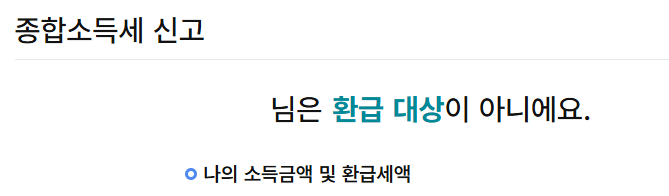 만약 이용 시간을 벗어나서 접속할 경우 첨부한 사진에서 볼 수 있듯이 '요청하신 서비스는 현재 서비스 중지 시간입니다.'라는 창을 만날 수 있다. 이때는 익일 오전 6시 이후 다시 홈택스(손택스)에 접속해서 서비스를 이용할 수 있도록 하자. 나는 지난해 동안 3.3%가 떼인 수익이 없다 보니 환급 대상이 아니라는 창을 볼 수 있었다.