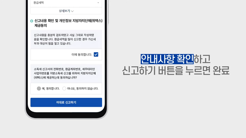 이미지 그대로다. 첨부한 이미지에서 볼 수 있듯이 홈택스(손택스)에 접속한 이후 '종합소득세 원클릭 환급신고' 메뉴를 선택한 이후 나와 환급액과 계좌번호를 확인하고, 후 안내사항과 동의사항을 체크하면서 '이대로 신고하기' 버튼을 누르면 모든 절차가 끝난다. 이 과정을 하나씩 밟는 데에는 5분이 채 걸리지 않아 깜짝 놀랐다.