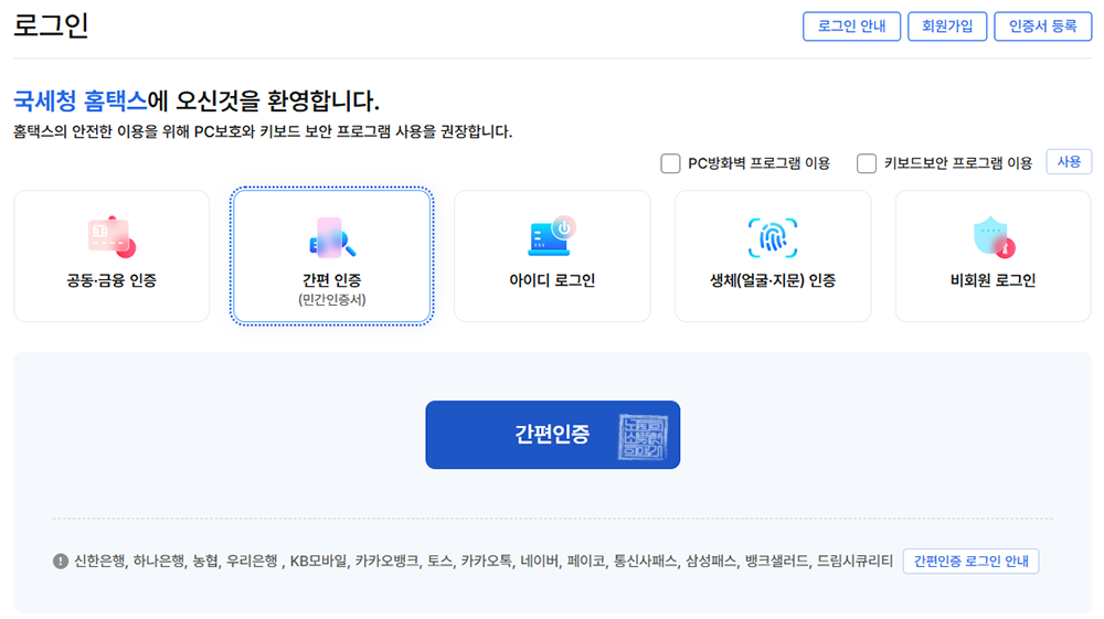 PC 화면으로 보는 홈택스나 모바일 화면으로 보는 손택스나 로그인 방법은 똑같다. 홈택스(손택스)에서 이용하고자 하는 서비스를 선택한 이후 '간편 인증'을 선택한다면 첨부한 사진에서 볼 수 있듯이 다양한 민간 인증서 중 하나를 선택해서 로그인할 수 있다. 한국 사람이라면 누구나 이용할 법한 선택지가 있었다.