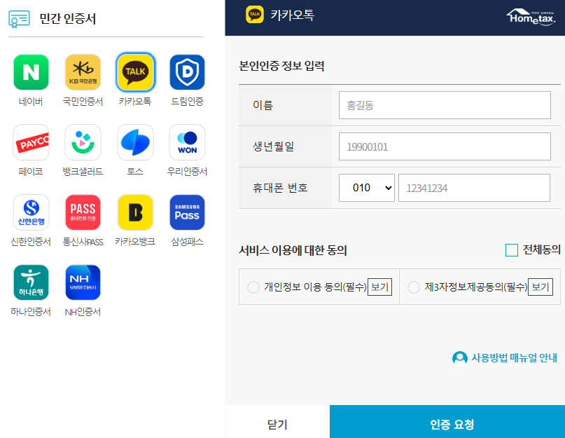 PC 화면으로 보는 홈택스나 모바일 화면으로 보는 손택스나 로그인 방법은 똑같다. 홈택스(손택스)에서 이용하고자 하는 서비스를 선택한 이후 '간편 인증'을 선택한다면 첨부한 사진에서 볼 수 있듯이 다양한 민간 인증서 중 하나를 선택해서 로그인할 수 있다. 한국 사람이라면 누구나 이용할 법한 선택지가 있었다.