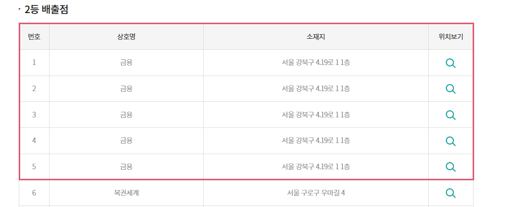 재미있는 점은 로또 1166회에서 수동으로 같은 번호 조합을 5개 구매해서 1등 5개에 당첨된 사람만 아니라 2등 5개에 당첨된 사람도 있다는 점이다. 2등 당첨자는 서울 강북구 4.19로 1 1층에 위치한 '금용'이라는 이름의 복권 판매점에서 나왔는데, 한 끗 차이로 1등을 놓쳤다고 해도 2등 5개 당첨금도 3억에 이르다 보니 절대 적지 않다.