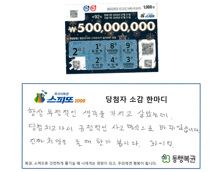 그렇게 나처럼 매주 복권을 꾸준히 구매하는 사람들은 위와 같은 주인공이 되고 싶은 바람을 마음 한구석에 품고 있을 것으로 생각한다. 현재 동행복권 홈페이지에 업로드되어 있는 스피도1000 92회 당첨자 후기를 읽어 보면, 일주일에 한 번씩 복권을 꾸준히 구매하다가 이번에 스피또1000 1등 5억 원에 당첨이 되었다고 한다.