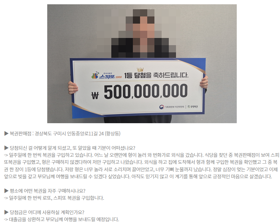 그렇게 나처럼 매주 복권을 꾸준히 구매하는 사람들은 위와 같은 주인공이 되고 싶은 바람을 마음 한구석에 품고 있을 것으로 생각한다. 현재 동행복권 홈페이지에 업로드되어 있는 스피도1000 92회 당첨자 후기를 읽어 보면, 일주일에 한 번씩 복권을 꾸준히 구매하다가 이번에 스피또1000 1등 5억 원에 당첨이 되었다고 한다.