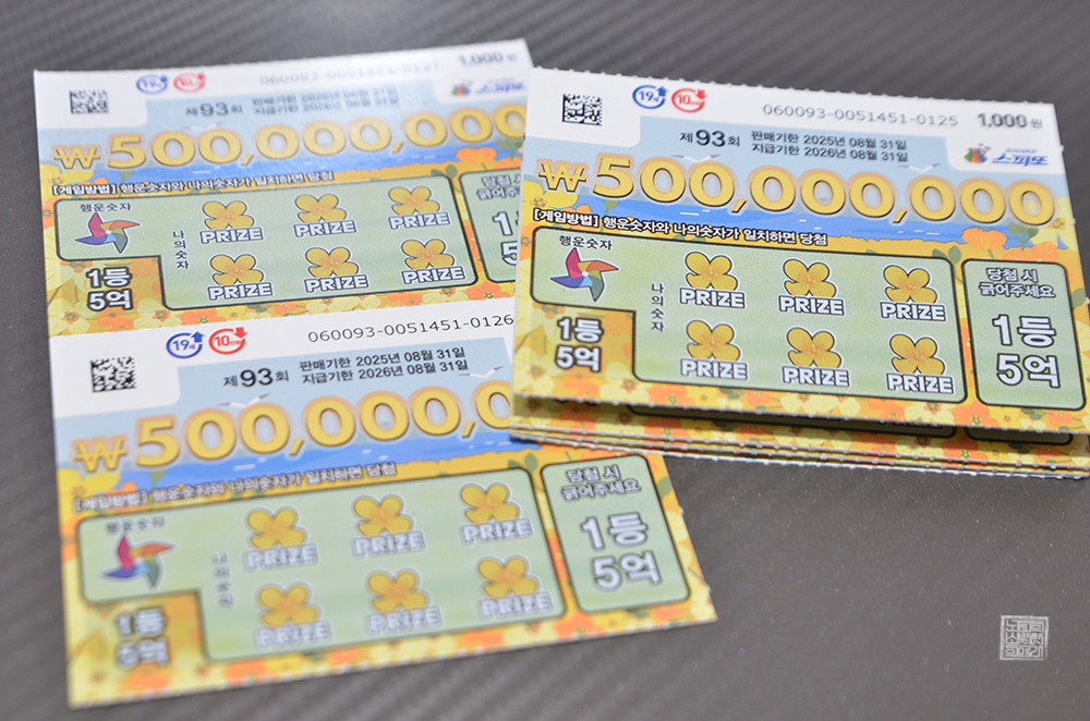 그뿐만 아니라 2등 2천만 원을 받을 수 있는 복권도 전체 45장 중에서 35장이 남아 있기 때문에 충분히 스피또1000 93회에 승부를 걸어볼 만하다고 생각한다. 그래서 나는 수중에 있던 1만 원 지폐 한 장을 가지고 스피또1000 94회를 새롭게 구매하는 게 아니라 아직은 스피또1000 93회를 중심으로 구매했다.