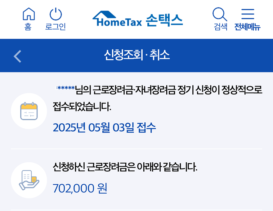 이전과 달리 홈택스(손택스)에서는 이런 절차가 무척 간편하게 정리되어 있기 때문에 근로장려금을 신청하는 데에도 약 5분이면 충분했다. 나라에서 을로 일하면서 열심히 살아가는 우리가 꼭 챙겨야 하는 지원금은 스스로 챙기지 않으면 어느 누구도 가르쳐주거나 건네주지 않는다. 오직 자신이 직접 챙겨야 함을 유의하도록 하자.