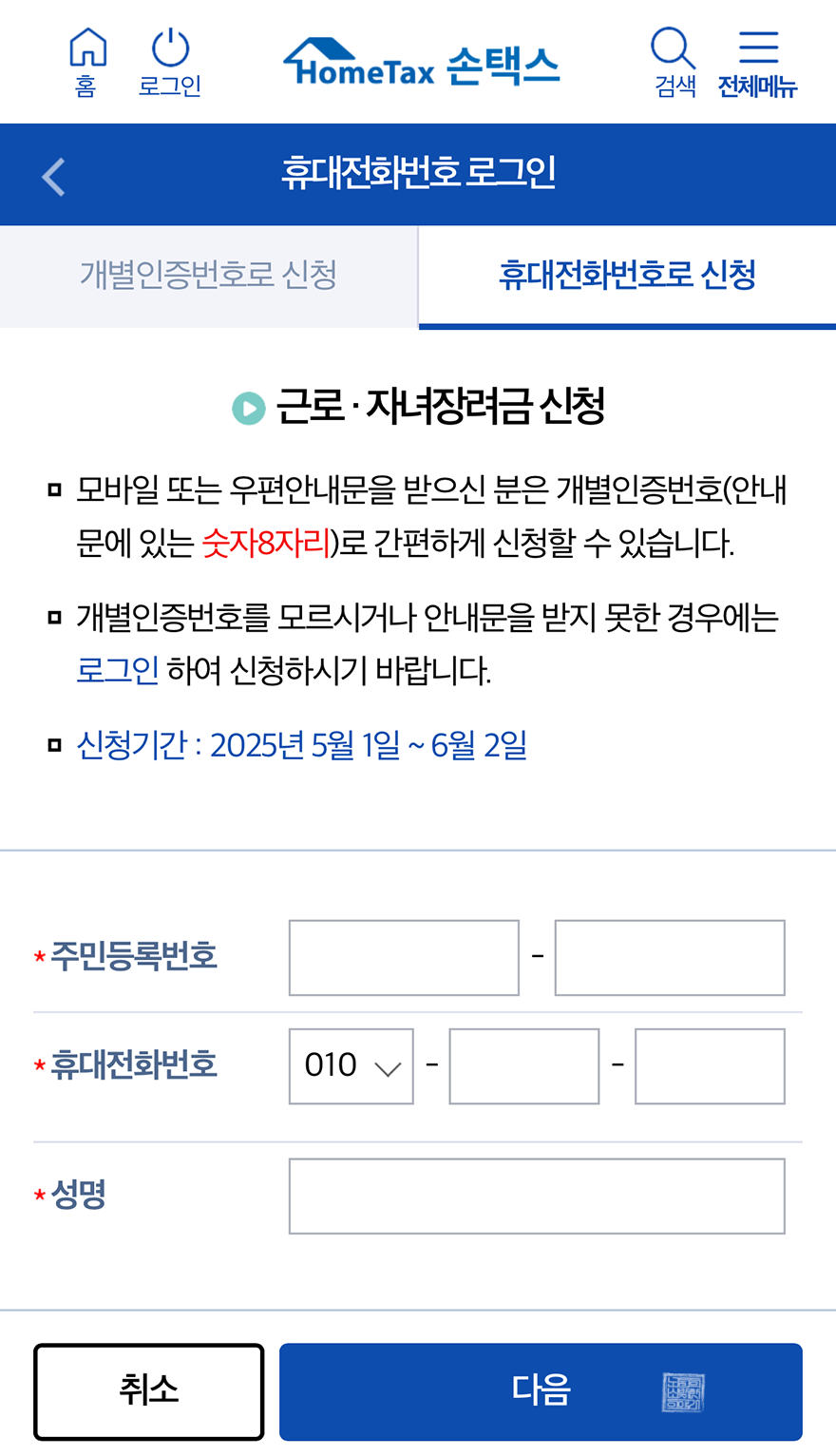 PC 홈택스 혹은 모바일 손택스를 통해 '근로장려금 신청' 배너를 둘러서 접속하면 첨부한 사진에서 볼 수 있는 화면을 만나볼 수 있다. 만약 국세청으로부터 개별인증번호를 받았다면 해당 개별인증번호를 입력해 진행할 수 있지만, 그렇지 않을 경우에는 주민등록번호와 휴대전화 번호, 성명을 입력한 이후 인증 과정을 거치게 된다.
