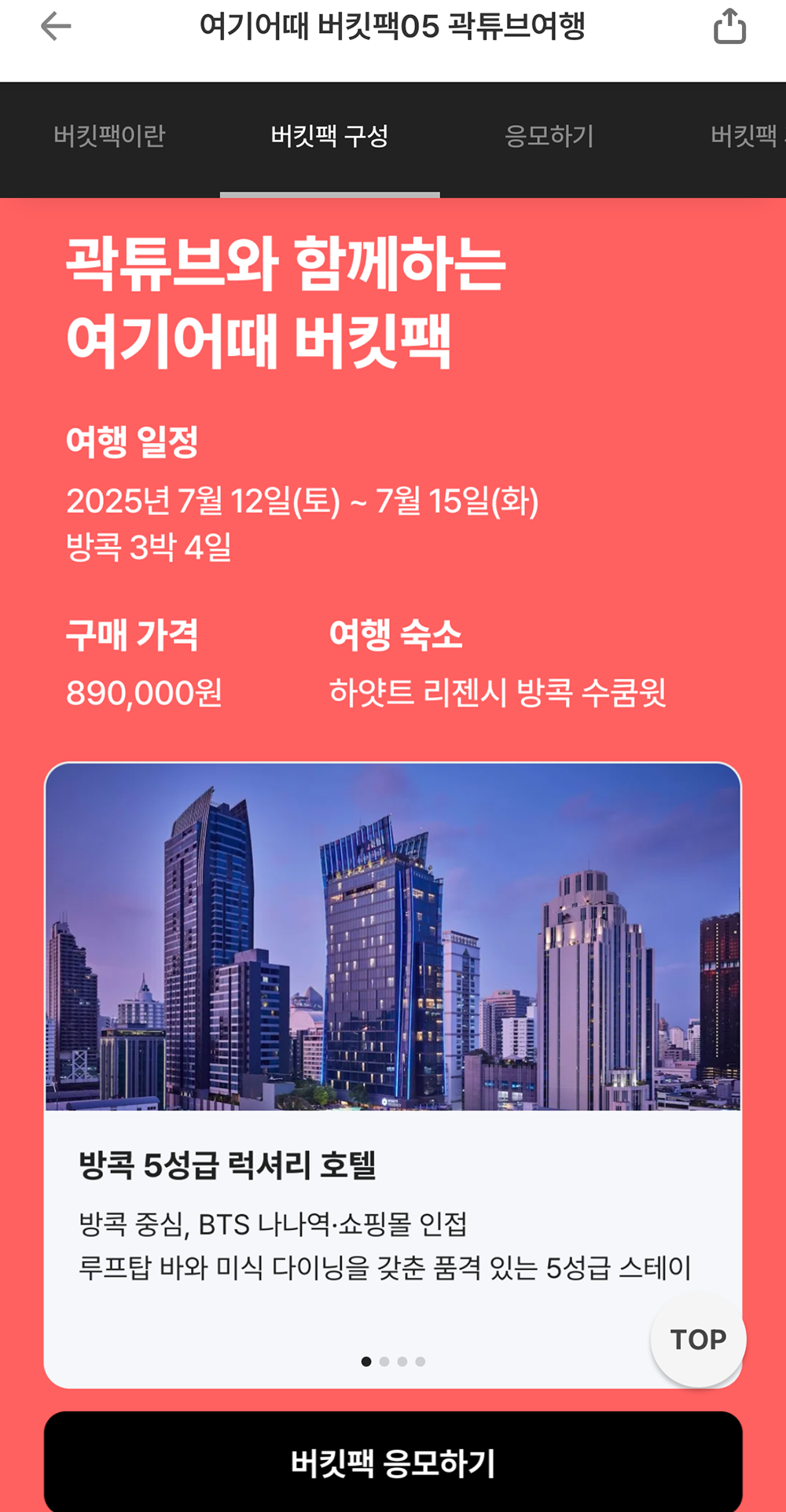 곽튜브와 함께 하는 여기어때 버킷팩의 가격은 89만 원으로… 여행 숙소는 하얏트 리젠시 방콕 수쿰윗으로 상당히 좋은 숙소로 보인다. 하지만 89만 원이라는 가격이 누군가에게는 부담이 될 수 있는 가격이다 보니 나 같은 사람은 이벤트에 당첨되어도 가지 못할 확률도 있다고 생각한다. 애초에 나는 이벤트에 당첨이 되어도 못 갈 것 같다.
