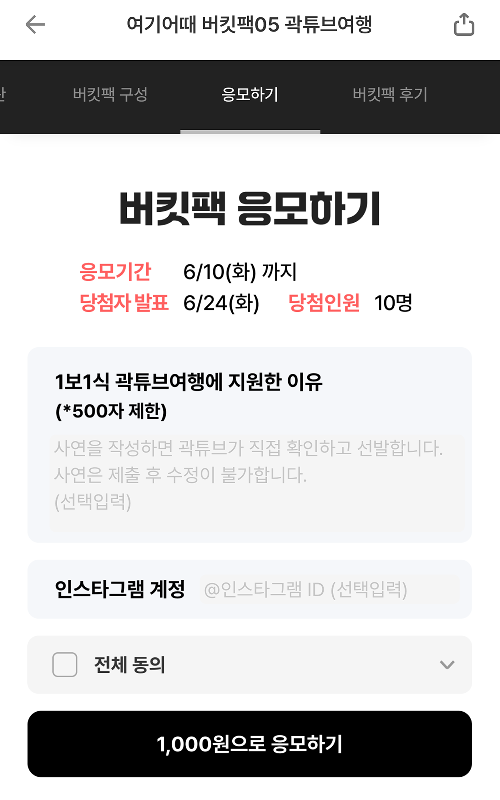 이번 곽튜브 버킷팩은 단순히 1천 원의 응모권을 구매해서 응모한 이후 랜덤 추첨 방식으로 돌리는 게 아니라 1보 1식 곽튜브 여행에 지원한 이유를 500자 안으로 적어서 응모를 하고, 그 이유(사연)를 곽튜브가 직접 확인하고 선발하는 과정을 거치는 방식이었다. 즉, 어떤 글을 쓰더라도 곽튜브가 내 글을 읽을 확률이 있었다.