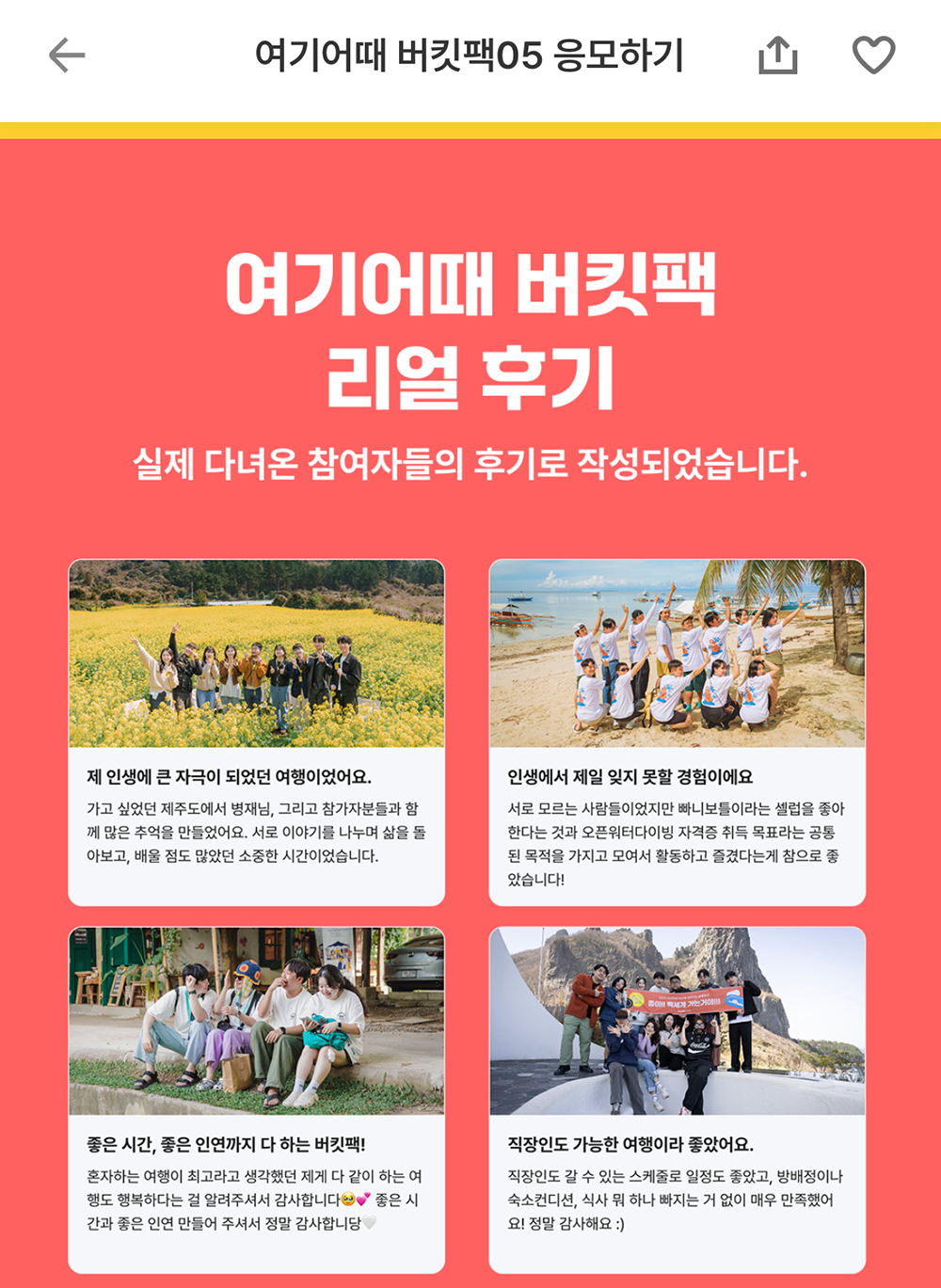 후기를 본다면 빠니보틀과 여행을 다녀온 후기도 볼 수 있었는데, 이런 특별한 시간을 가질 수 있다면 분명히 투자한 돈과 시간 그 이상을 얻을 수 있다고 생각한다. 비록 버킷팩에 당첨되어도 패키지를 구매할 수 있는 여력이 없다고는 해도 그건 그때 가서 생각하기로 하고… 곽튜브와 함께 하는 여행에 관심이 있다면 꼭 응모해 보자!