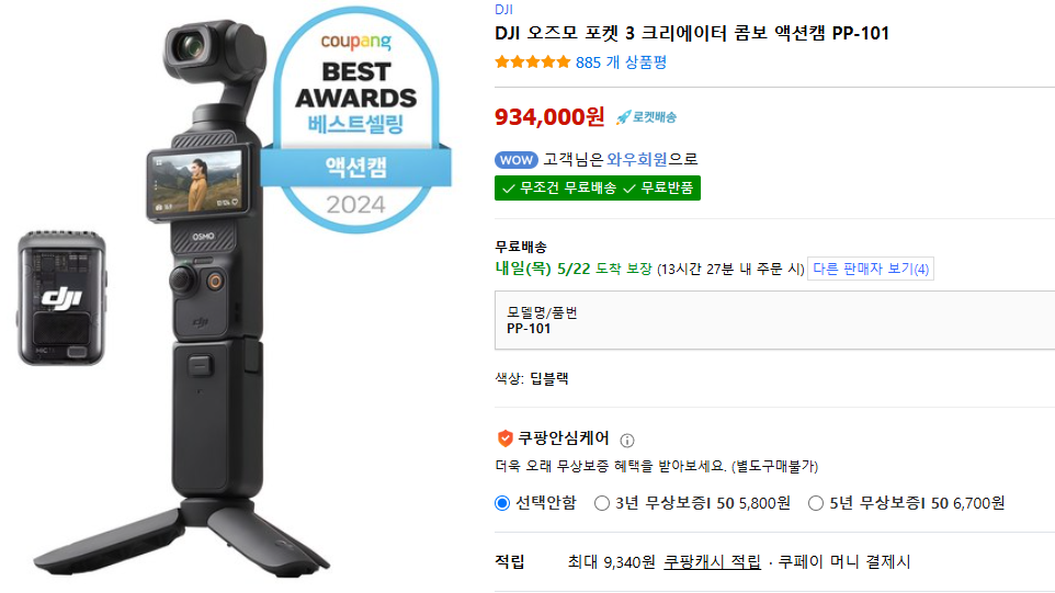 현재 쿠팡을 기준으로 DJI 오즈모 포켓3 크리에이터 콤보는 최저가 93만 4천 원에 판매되고 있다. 단품이 72만 원인 것을 생각한다면 전용 마이크와 함께 108도 넓은 시야각을 지원하는 광각 렌즈, 대용량 배터리 그립과 삼각대가 포함된 것을 생각하면 20만 원을 더 쓰고 크리에이터 콤보를 구매하는 게 이득이라고 생각한다.