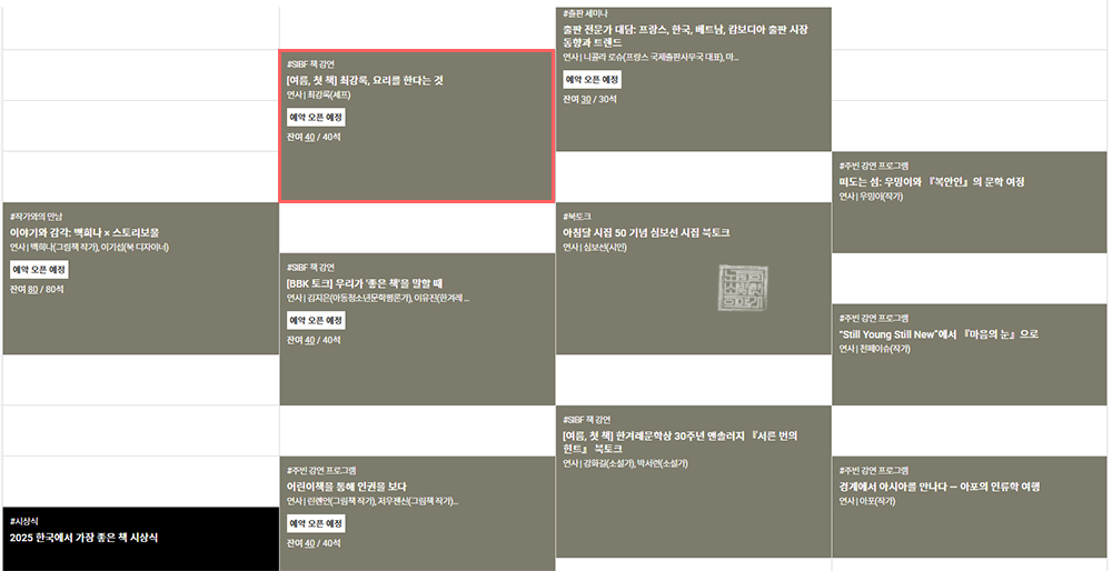 해당 강연 프로그램은 네이버 예약이 아니라 서울 국제 도서전 홈페이지-프로그램에서 예약을 할 수 있는데, 각 프로그램 별로 예약 오픈 날짜와 시간이 다르기 때문에 자신이 듣고 싶은 강연이 있을 경우 미리 체크하는 게 중요하다. 최강록 셰프의 강연은 위의 사진에서 볼 수 있듯이 5월 26일(월) 오전 11시 오픈 예정이라 다음 주 월요일이다.
