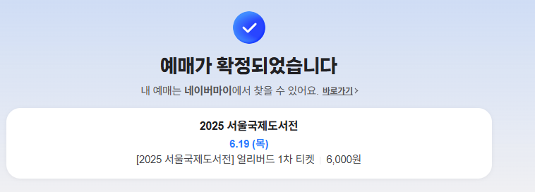 여유가 될지는 모르겠지만… 일단 오늘 쓸 수 있는 돈은 2025 서울 국제도서전 얼리버드 1차 티켓을 예매할 수 있는 돈뿐이라서 19일에 맞춰 티켓을 예매해 두었다. 아직 2025 서울 국제도서전 얼리버드 1차 티켓 예매를 하지 않았다면 지금 바로 예매할 수 있도록 하자. 50% 할인을 받을 수 있는 기간은 5월 26일(월)까지 뿐이다.