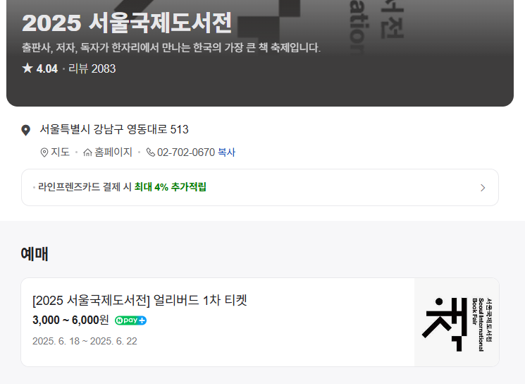 서울국제도서전 티켓 예매는 네이버에서 '2025 서울 국제도서전'을 검색할 경우 첨부한 사진에서 볼 수 있는 그대로의 화면을 통해서 예매 페이지로 이동할 수 있다. 카카오예약이 아니라 오직 네이버 예약에서만 가능하다는 게 아쉬워도 어쩔 수 없었다. 곧바로 예매 페이지로 이동하려면 아래의 링크를 클릭해 보자.