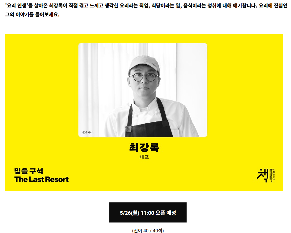 해당 강연 프로그램은 네이버 예약이 아니라 서울 국제 도서전 홈페이지-프로그램에서 예약을 할 수 있는데, 각 프로그램 별로 예약 오픈 날짜와 시간이 다르기 때문에 자신이 듣고 싶은 강연이 있을 경우 미리 체크하는 게 중요하다. 최강록 셰프의 강연은 위의 사진에서 볼 수 있듯이 5월 26일(월) 오전 11시 오픈 예정이라 다음 주 월요일이다.