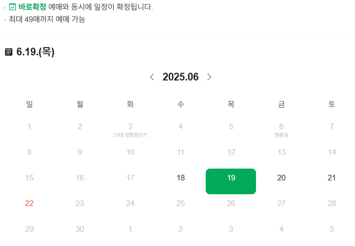 해당 링크를 통해 이동할 경우 사전 예매하기를 누르면 날짜를 선택할 수 있다. 1인 당 최대 48매까지 예매가 가능하다고 하지만 여러 날짜를 한 번에 구매할 수는 없었다. 즉, 18일에 방문하고 19일에도 방문하고 싶을 경우에는 따로 결제를 해야 하다는 불편함이 있었는데, 나는 18일과 19일 둘 중 하나를 고민하다가 19일을 선택했다.