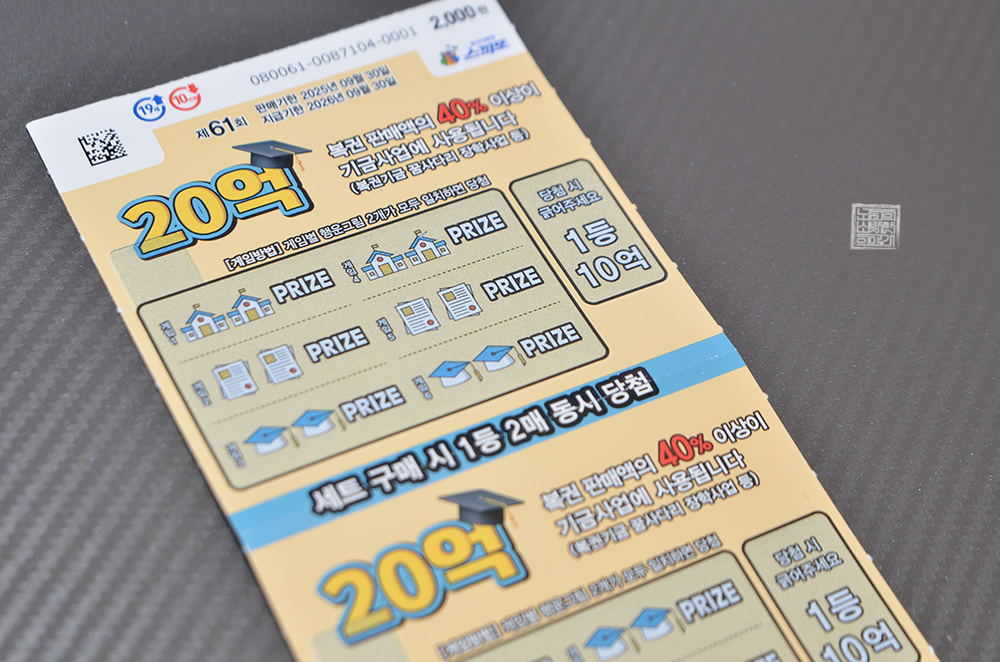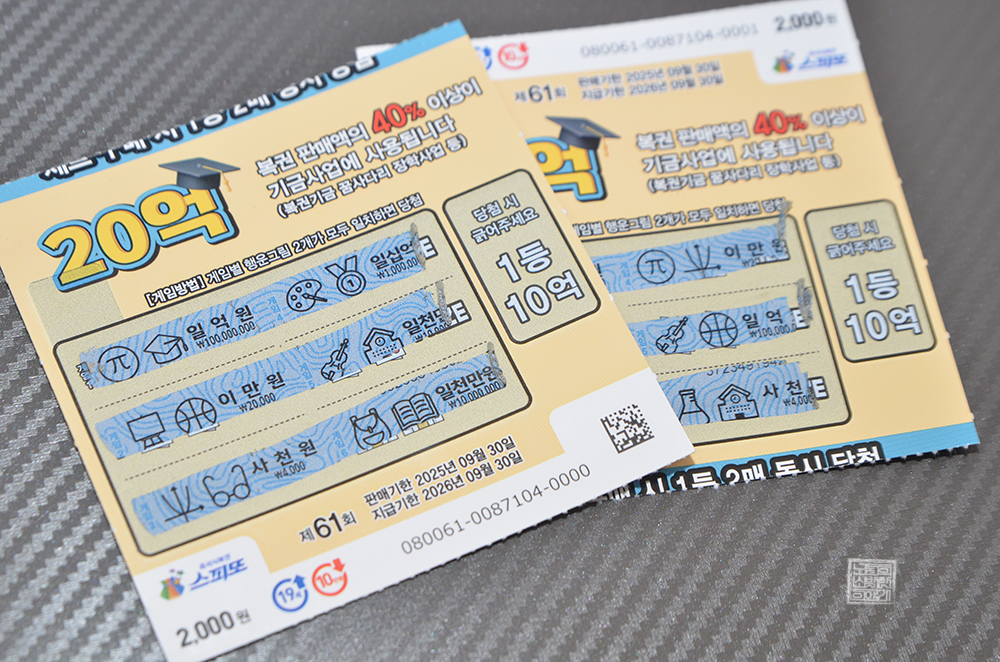 새롭게 디자인된 스피또2000 61회에는 '복권 판매액의 40% 이상이 기금 사업에 사용됩니다(복권기금 꿈사다리 장학사업 등)'이라고 적혀 있는데… 그런 좋은 취지에 돈을 쓴다는 생각으로 복권을 소량 구매하는 건 절대 나쁜 일이 아니라고 생각한다. 아쉽게도 4천 원치 구매한 스피또2000 61회는 모두 꽝이 되고 말았다.