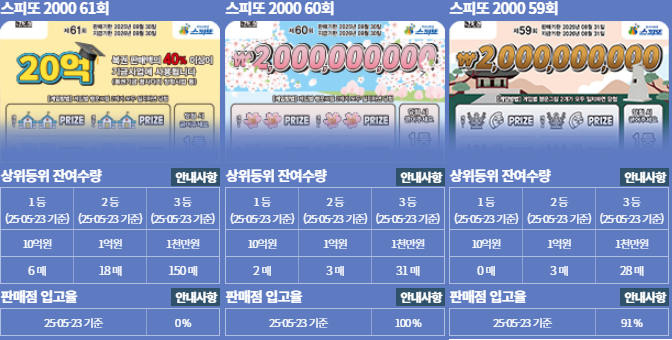 현재 홈페이지를 통해 확인할 수 있는 스피또2000 시리즈의 상위등위 잔여수량은 5월 23일(금)에 갱신된 것으로, 상위등위 잔여수량을 보면 60회에서 1등 10억 세트 하나와 2등 1억이 3장, 3등 1천만 원이 무려 31장이나 남아 있는 것을 확인할 수 있다. 놀랍게도 스피또2000 59회도 아직 2등 1억이 3장, 3등 1천만 원이 28장이나 남아 있었다.