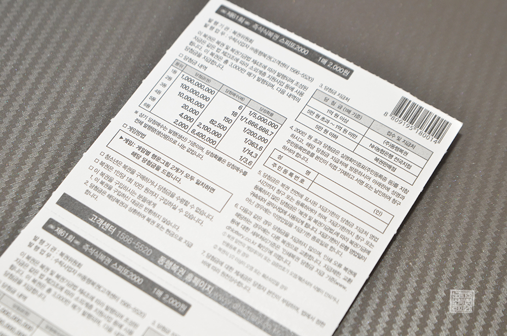 지난주에 복권을 구매하기 위해서 평소 이용하는 복권 판매점을 찾았는데, 공교롭게도 스피또2000 60회는 잔여수량이 다 떨어져서 구매할 수가 없었다. 그 복권 판매점만 아니라 혹시 즉석복권 스피또2000 60회를 판매하는 다른 복권 판매점이 있나 싶어 주변 복권 판매점 5곳을 돌아다녔는데… 60회는 완전히 씨가 말라 있었다.
