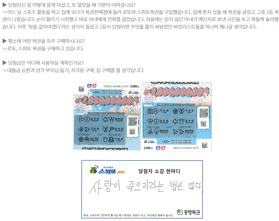 뭐, 복권을 구매하는 데에 복잡한 생각을 하기보다 당첨자 인터뷰를 통해 알 수 있듯이 평범히 오늘 하루를 열심히 보내면서 집으로 돌아오는 길에, 지나가는 길에 복권 판매점이 있으면 복권을 구매하면 될 것 같다. 나는 아직 배가 고프기 때문에 살짝 집착이 되는 것 같기는 해도 어디까지 삶의 일부로 복권을 구매하고 있다.