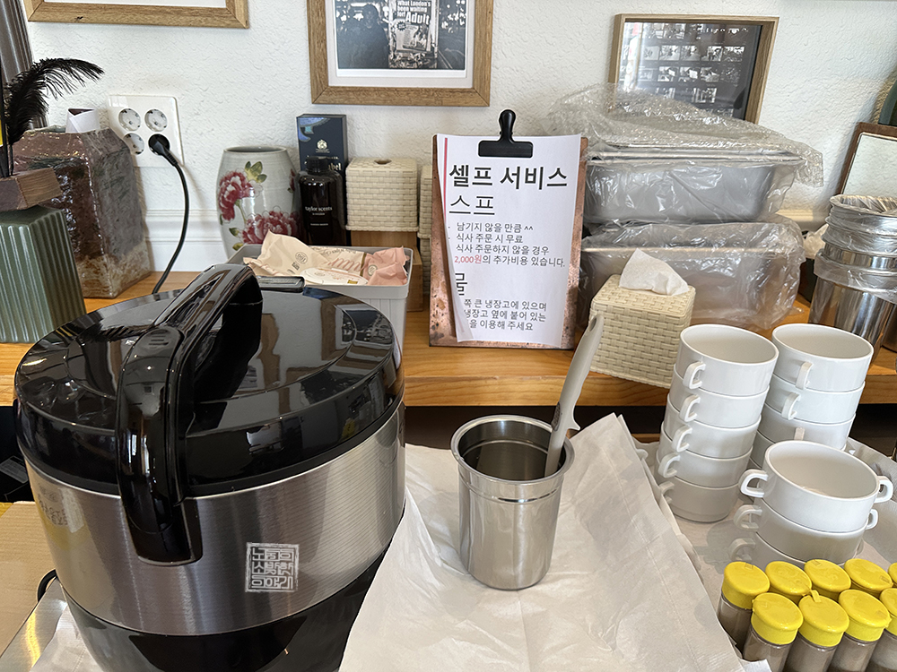이곳에서 크림 스프와 물은 모두 셀프이기 때문에 자신이 직접 가지고 와야 했는데, 크림 스프 같은 경우에는 식사 주문 시 무료이지만 식사 메뉴를 주문하지 않을 경우에는 2천 원의 추가 요금을 받는다고 적혀 있었다. 아무래도 수제 돈까스 집이라고 해도 펍이기도 한 곳이다 보니 식사를 하지 않는 사람도 있는 듯했다.