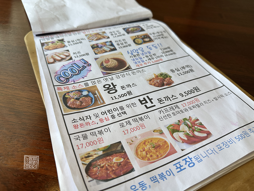 펍 레드풋 수제 왕돈까스의 메뉴판은 이렇게 A4 용지가 인쇄되어 있었는데, 수제 돈까스 전문점이다 보니 메인은 돈까스였다. 하지만 돈까스 외에도 곁들여서 먹을 수 있는 혹은 사람들끼리 맥주 한 잔을 하면서 마실 수 있는 메뉴가 많았다. 당일 우리는 등심 돈까스 두 개와 함께 국물 떡볶이, 냉모밀 한 개를 주문하기로 결정했다.