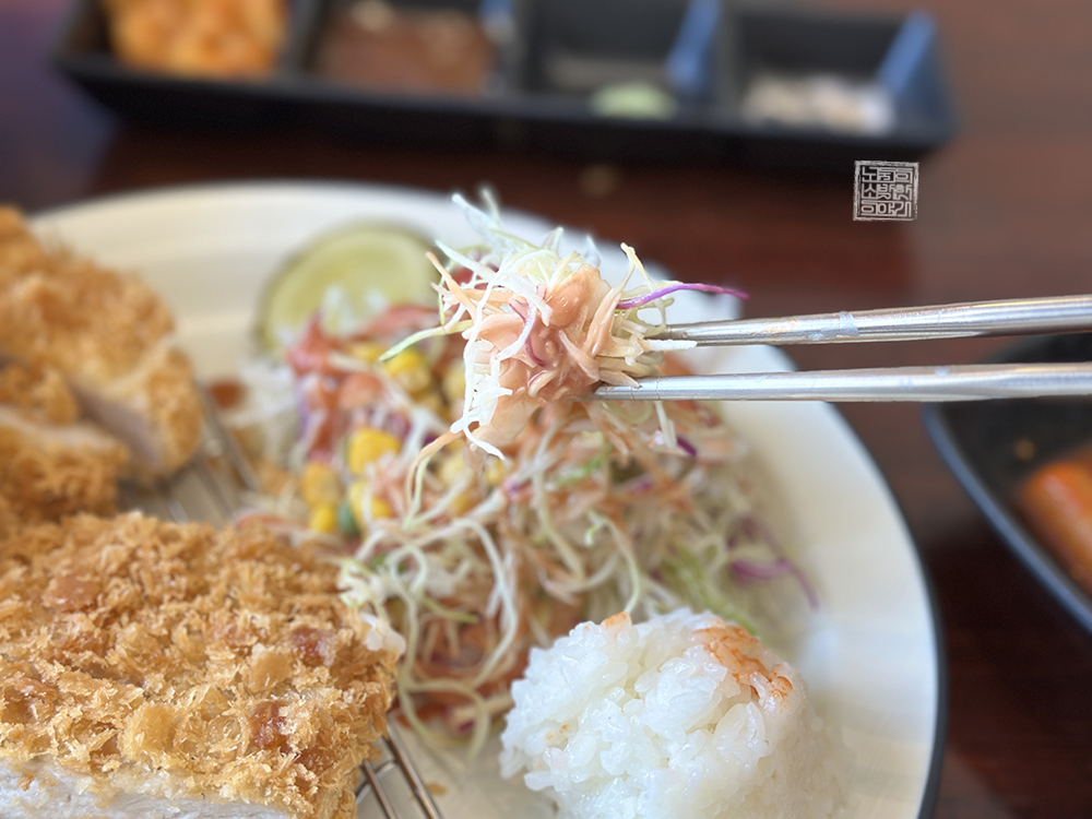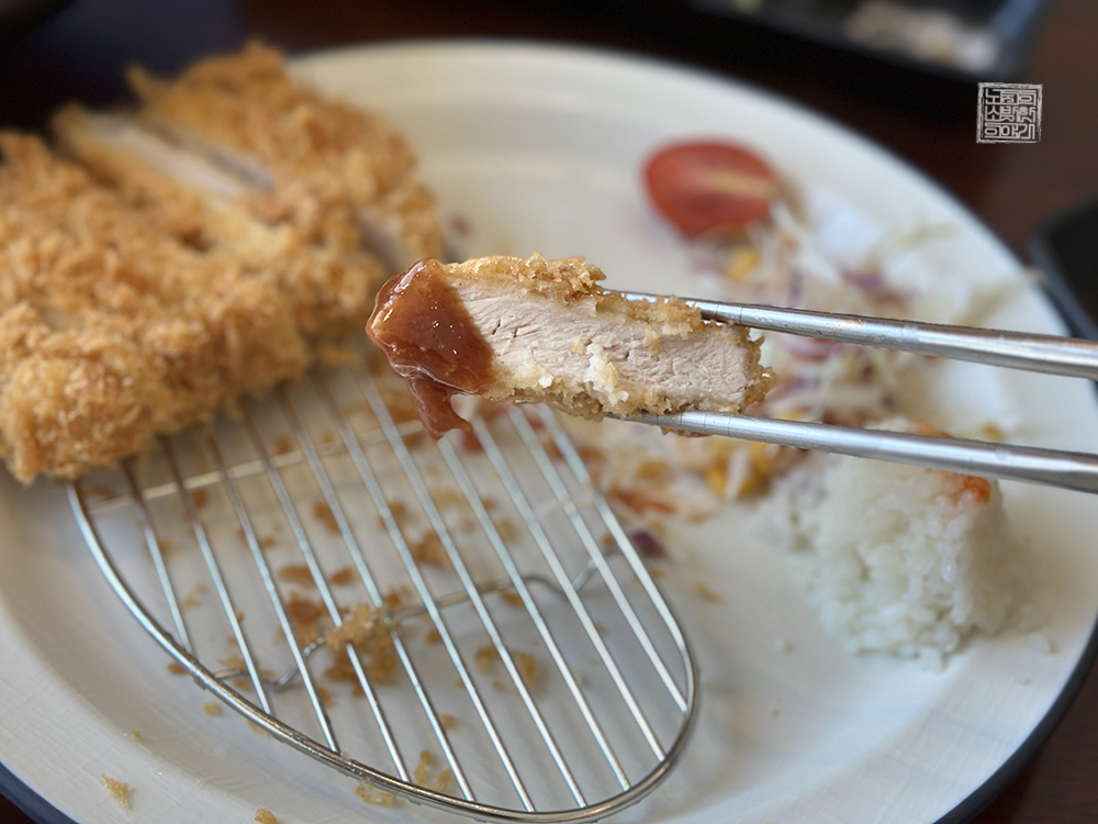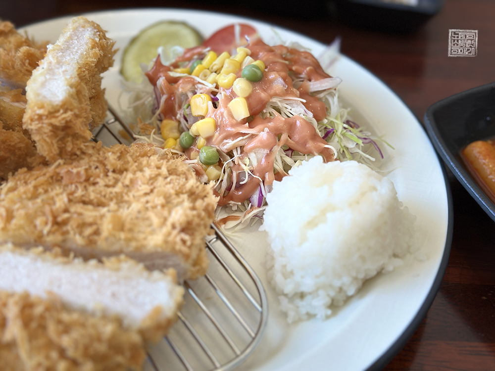 이미 겉보기부터 맛있어 보였던 등심 돈까스는 실제로 먹어보았을 때도 딱히 흠 잡을 곳 없이 맛있었다. <워크맨>의 '단순 작업' 코너에 출연했던 스윙시는 돈까스만큼 완벽한 음식은 없다고 말했었는데, 당시 돈까스를 먹으면서 나는 정말 그렇다고 생각했다. 등심 돈까스가 가진 바삭하고 튀김과 촉촉한 고기의 밸런스가 잘 맞았다.