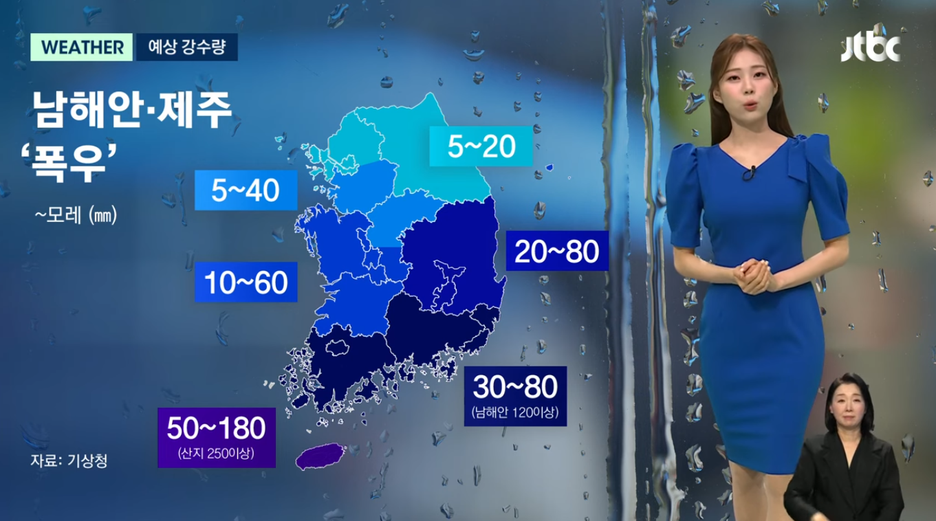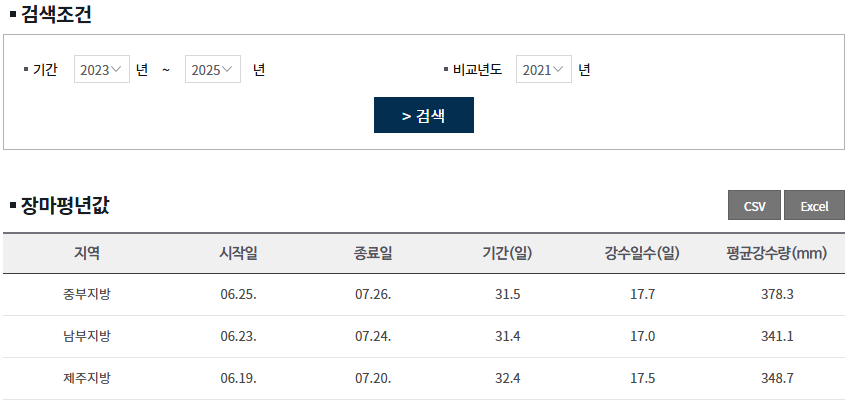 뉴스를 통해 접했던 6월 첫 번째 장마 강수량을 보면 남부 지방은 30~80mm 정도로 그렇게 많은 편은 아니었다. 하지만 이런 날씨가 지속해서 이루어진다면 강수량을 자연스럽게 높아질 수밖에 없는데, 지난 2024년을 본다면 남부 지방은 6월 23일부터 본격적인 장마가 시작되어 7월 24일까지 약 31.4일 동안 비가 계속 내렸다.