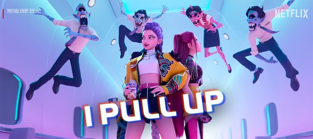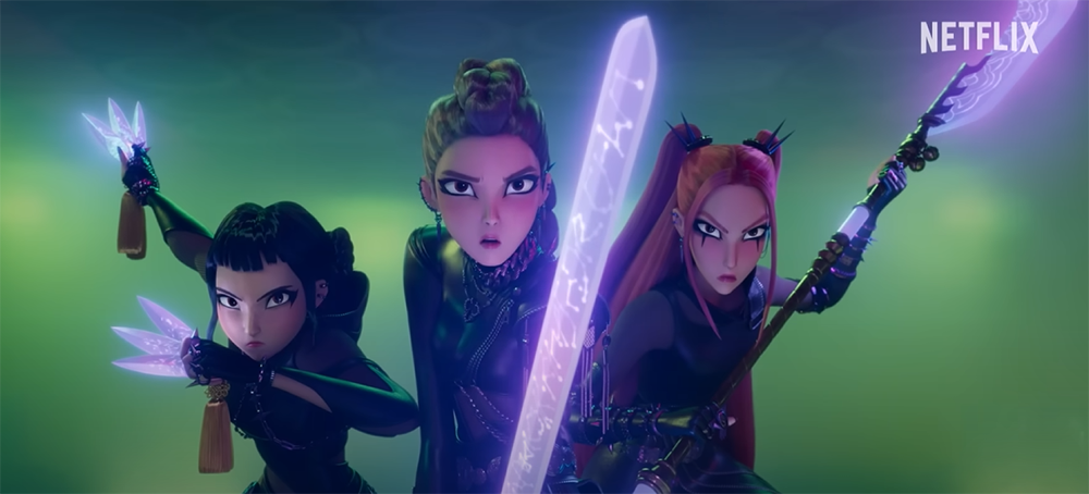 넷플릭스 애니메이션 영화 <케이팝 데몬 헌터스>는 앞서 말한 그대로 케이팝 스타들인 루미, 미라, 조이 세 사람이 아이돌 가수로 활동하면서 현세에 현현한 악귀들을 퇴치하는 이야기다. 이 과정에서 그녀들은 'TAKE DOWN'을 비롯해 여러 노래를 부르면서 다양한 각자만의 무기를 활용해 싸우는데… 이 과정도 제법 볼만했다.