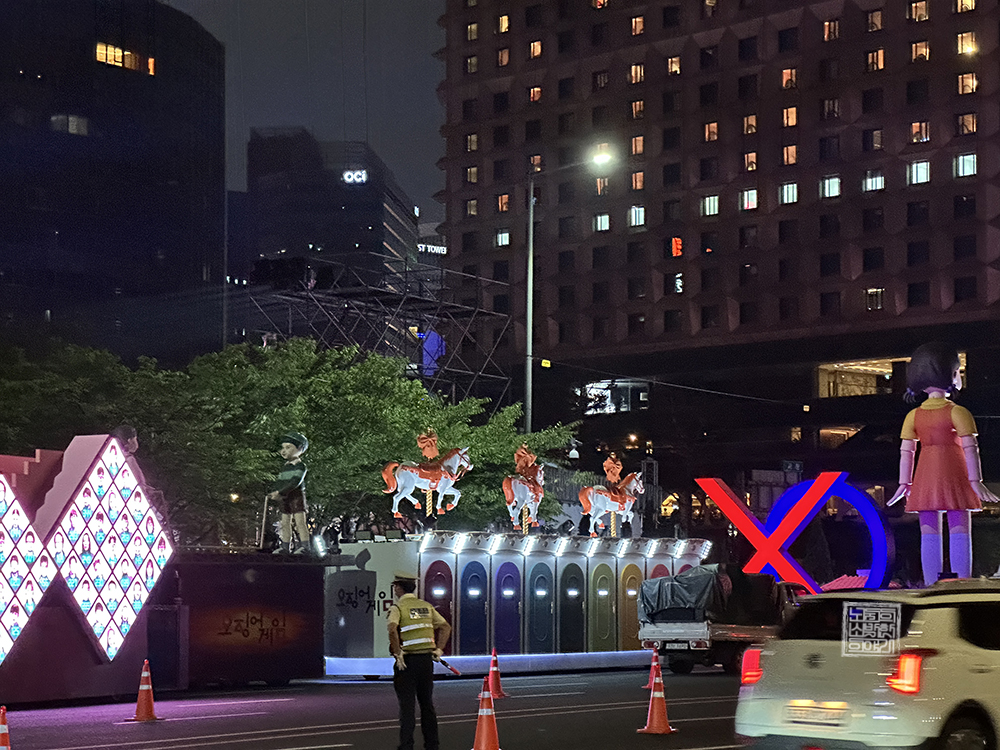 그리고 <오징어게임 피날레 팬 이벤트>는 퍼레이드의 시작과 함께 서서히 본막을 향해 다가가고 있었는데, 시간이 계속 지연이 된 탓에 나는 조금 불안함을 감출 수가 없었다. 왜냐하면, 당일 김해로 돌아가는 버스 막차(10시 30분 출발)를 예매해 놓은 터라 적어도 약 9시 30분에는 이 자리를 벗어나야 했었기 때문이다.