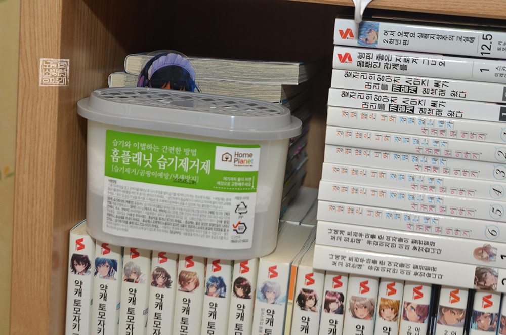 현재 나는 홈플래닛 습기제거제를 책장 4군데에 하나씩 배치하였을 뿐만 아니라 속옷을 보관하는 수납함에도 하나 배치를 해 놓았다. 책은 책장에 보관하고 오랜 시간이 지나면 자연스럽게 색이 바라기 마련이지만, 습기를 제대로 관리하지 않으면 눅눅해지는 현상이 발생하기 때문에 습기제거제 한두 개 정도는 책장에 꼭 배치해야 한다.